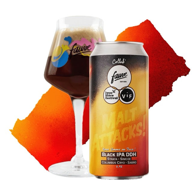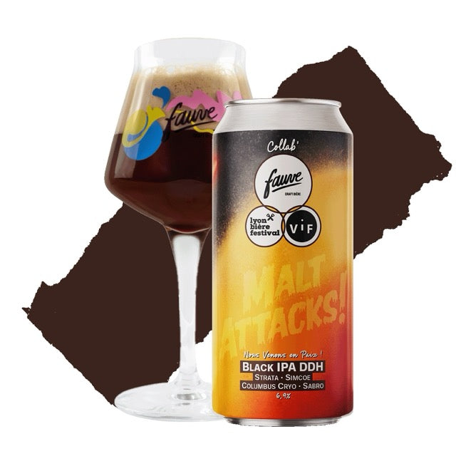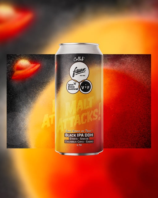 Le Lyon Bière Festival nous a fait l'honneur de nous nommer brasserie marraine de l'édition 2026 avec nos ami.e.s de VIF ! Le thème de l'année est "Malt Attacks" alors pour fêter ça, on a brassé une Black IPA DDH : une bière mettant à l'honneur des malts torréfiés tout en reflétant l'aromatique exubérante des houblons Strata, Simcoe, Columbus Cryo et Sabro.